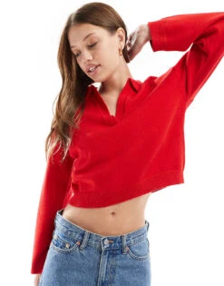 Cotton:On Cotton On Knitted V Neck Polo Sweater With Back Graphic In Red For Women Rebel Red/13